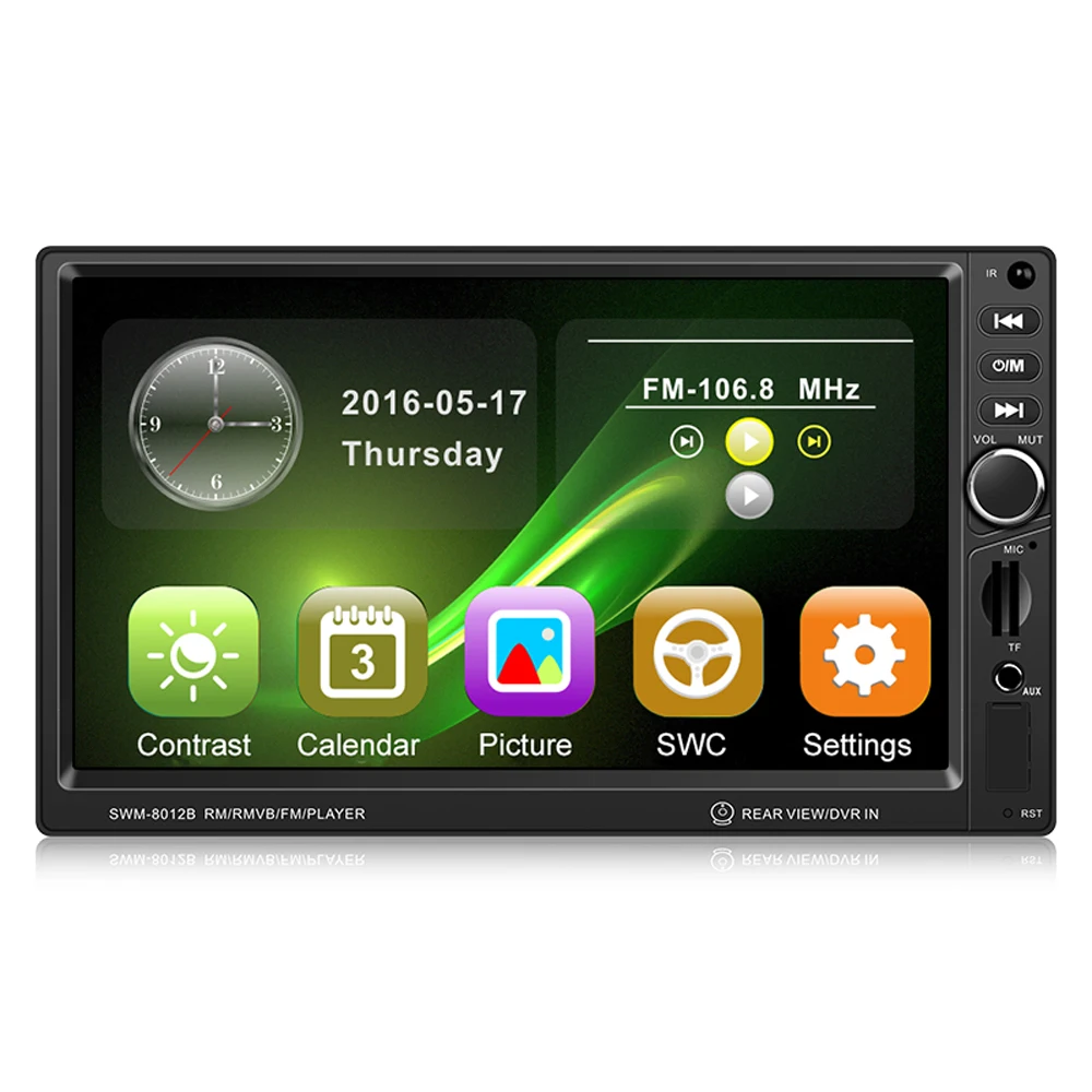 Features:1.7-inch HD large display screen, pleasing to your eye. 2.Support Bluetooth and mini TF card. 3.Multiple languages display, convenient to use. 4.Easy to install, time and effort saving. 5.With brake prompt function, more safe for you. 6.You can enjoy wonderful music in long boring journey. 7.Compact size, space saving, with front AUX audio input.Notes:We have three kinds of packages: Without Camera , With 4 LED Camera ,With 8 IR Camera and With 12 LED Camera. Please choose the one you need. Thank You! And Our Remote Control Not Have Battery, It Need Buy From Your Supermarket. Description: Decoding chip: Allwinner C500System: winceType: MP5Voltage: 12VScreen size: 7 inchesScreen resolution: 800*480Phone connection: not supportGPS: not supportRadio band: FM, FM1, FM2, FM3Radio chip: QN8035Dual screen display: not supportReverse video input: supportReverse detection method: tail line detectionBrake prompt function: yesSteering wheel control function: yesBluetooth: supportPower amplifier chip: 12VTAD7388Radio frequency: 87.5M-108MSecure digital card slot: Mini TF CardGPS card slot has no GPS functionRemote control: yes(11 buttons)USB interface: yesReset button: yesPlug type: ISO plugRCA terminal input: 2 channel audio output, 2 channel audio input, 2 channel audio output, 1 channel video input, 1 road reverse inputFront AUX audio input: yesVolume knob: yesAudio format: support MP3/WMA/WAV/OGG/FLAC/APEVideo format support RM/RMVB/MP4/FLV/MKV/3GP/AVI/ASF/SWFMP1/MP2Picture format: support JPEGLanguages: English, Chinese, French, Portuguese, Spanish, Turkish, Italian, German, Russian And so on.Specifications: Model: SWM-8012BSize: 178*101*58mmPackage Size: 208mm*115mm*150mmType: Without Camera, With 4 LED Camera, With 8 IR Camera ,With 12 LED CameraPackage Included: Package A: Without Camera 1 x Car Radio MP3 Player1 x Steering Wheel Remote Control2 x Power Cable1 x User Manualor Package B:With 4 LED Camera: