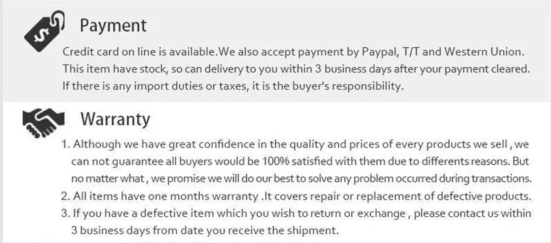 If the product you receive is not as described or low quality, the seller promises that you may return it before order completion (when you click "Confirm Order Received" or exceed confirmation timeframe) and receive a full refund. The return shipping fee will be paid by you. Or, you can choose to keep the product and agree the refund amount directly with the seller.