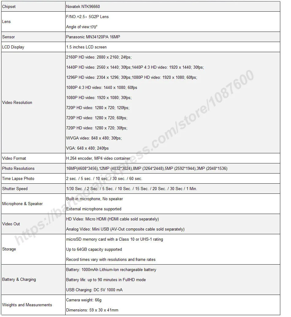 2K 2560 * 1440; 30fps, 1080p 60fps full HD video recording cycle;