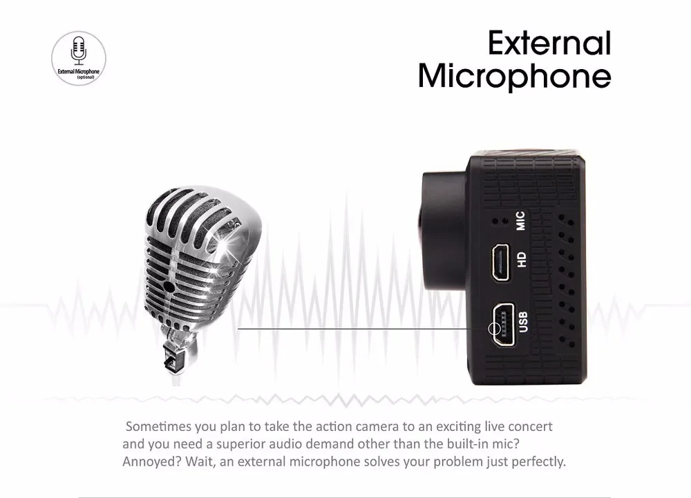Support for external microphone (microphone sold separately)