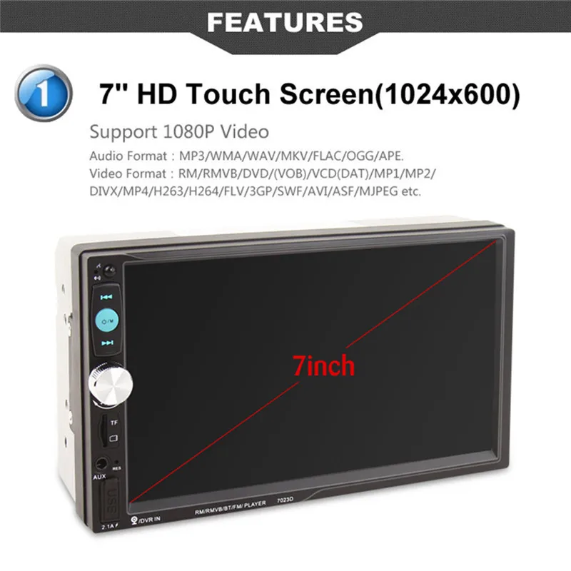 On-time Delivery: If you do not receive your purchase within 60 days, you can ask for a full refund before order completion (when you click "Confirm Order Received" or exceed confirmation timeframe).Fast Sale 7023D 2Din 7\'\' HD 1024*600 Bluetooth Car Radio MP5 Player with Card Reader Radio Tuner with Camera Car Stereo MP5 Player Auto