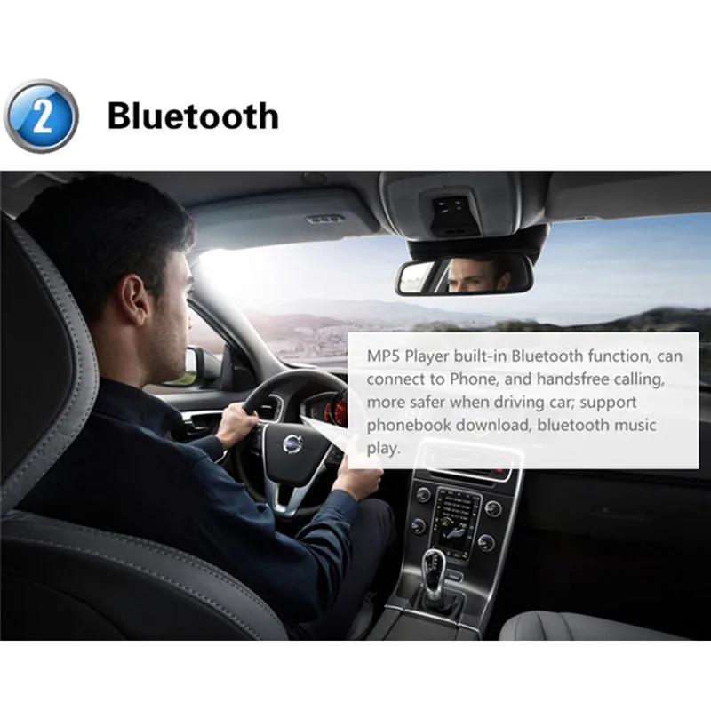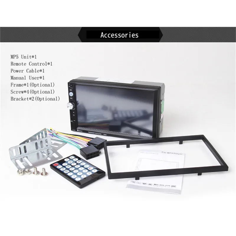 Product Features:1. With SD / MMC card slot and USB port2. Support 2G/4G/8G/16G memory card extention (Including High-speed USB Transmission)3. With Bluetooth function, support hands-free calls4. With rear view camera function5. Support MP3 / JPEG / WMA / AVI file format,etc6. Stereo electronic tuner,scan & store stations automatically7. Electronic tuning, More than 3 Bands(FM1,FM2,FM3)8. Display song words and names9. Power-Off has auto-memory store function under radio or SD/MMC/USB Mode10. Built-in radio FM tuner, automatic search platform function11. EQ sound control, stereo, left channel, right channel selection12. Multiple circuit protections13. Mosfet : max power output,human engineering coding volume knob14. Multi-functional IR remote control , mute Control Specifications:1. Item Type: Car Stereo Audio MP5 Player2. Model: 7023D3. Color: Black4. Working voltage: 12VDC5. Mid frequency: 10.7MHz6. Tuning range: 87.5—108MHz7. Speaker impedance: 4ohm8. Volume control: +/-8 dB (bass 10KHZ 100HZ)9. Applicable sensitivity: 15dB10. Signal to noise ratio: 50dB11. Stereo separation degree: 30dB12. Output power: 4 * 50W13. Resolution : 1024*600 Package included:1X Car Stereo Audio MP5 Player1X Remote Control1X English Manual1X Set of Frames,screws, fasteners2X Cables1x Rear View Camera( optional ) 1.The size of the machine2 Din :17.8 * 5.8 cm ; 2 Din : 17.8 * 10.2 cm 2.Will this radio work on my car?You can make sure the size of Center console on your car3.Can not open the machineRed wire :Car key control lineYellow wire :Memory lineA Yellow and red wires to “+” , Black wire to “-”.B if you can not identify “+”“-”of your car wires, please use a multimeter to test(SD card may also cause non-boot situation, the solution is to format)4.No memory exchange red and yellow line location5.No sound(Line does not match),how to solve? A:Choose two of the eight lines to connect the speaker. If there is a sound, the machine is good, if there is no sound , machine is bad. B:A speaker must be connected to two lines, a total of four speakers, eight lines6.USB ,SD can not work Directly format, clear messy files7.Rear camera not work Connect pink wire8. Radio can not recieve signal Our machine frequency : 87.5mHz-108mHz , Russian frequency :65.0~74.0MHz/65-108MHz , when less than 87.5mHz , you can not recieve signal , it is normal .9.I do not know why not work A:Poke the reset key with a toothpick or something else (RST) B:Turn off the power, reboot Main product is Vehicle Camera, Digital TV, DVD, MP5, LED and a great variety of car Audio and Video products, which is novel and attractive.