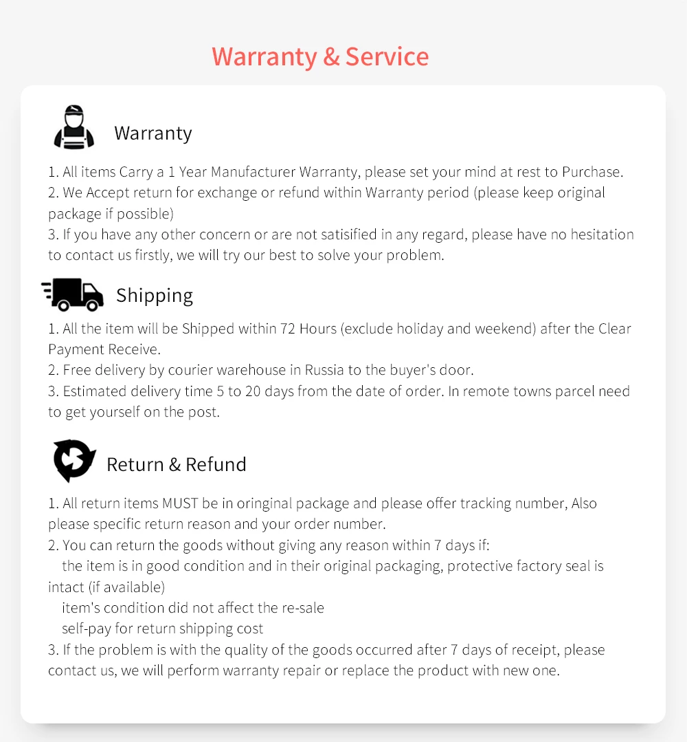 If the product you receive is not as described or low quality, the seller promises that you may return it before order completion (when you click "Confirm Order Received" or exceed confirmation timeframe) and receive a full refund. The return shipping fee will be paid by you. Or, you can choose to keep the product and agree the refund amount directly with the seller.N.B.: If the seller provides the "Longer Protection" service on this product, you may ask for refund up to 15 days after order completion.