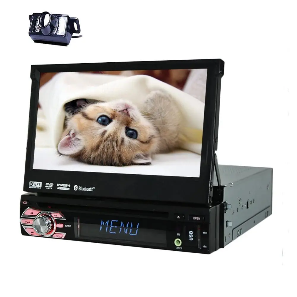 In-Dash Single-DIN 7 inch Motorized Flip-Up Touchscreen Car DVD/CD/USB/SD/MP4/MP3 Player Receiver, Bluetooth, Detachable Front Panel, Wireless Remote