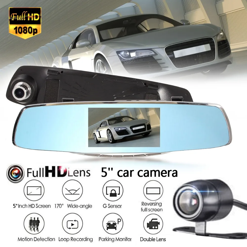NiceFeature: -100% new and high quality. -Start the car engine, the recorder automatically starts to open the recording function, the charge indicator lights, video light is blinking. -Switching off the engine, the recorder automatically save the contents of the recording and shut down, the recorded image segment stored in the TF card, TF card memory is full when the recorder will overwrite recording after the earlier recording. -Support camera, motion detection, collision sensor, a key lock function, the date and time settings, a key mute function, U disk mode, shooting file playback, reversing visual function, monitoring parking. -Mirror using blue film at night can weaken the rear of the vehicle headlight reflector, effectively improve traffic safety at night. -5-inch LCD screen. -1080p 1200 megapixels Full HD high quality resolution. -170 degree Ultra High-definition wide angle lens. -CMOS built-in. Specifications: Product name: Rearview mirror dual channal recorder Product features: 170 level is very wide, full HD 1080p Display size: 5"TFT Camera lens: 170 A+level lens Language: Multi language File format: MOV Video resolution: 1920*1080p 1280*720p Video format: H.264, Audio: AAC The effect of color: Standard Loop video: Seamless loop video,no leakage Car switch machine: Support Motion detection func: Support Carrier medium: built-in (total: 1024MB) Photo: 500M Photo format: JPEG Memory card: TF(Maximum support 32GB) Sound: Built-in Video format: PAL/NTSC Current frequency: 50HZ/60HZ Power interface: 12-24V 2A Battery: Built in 450mAh Package Include: 1x 5-inch HD 1080P Car DVR(TF Card not included) 1 x 12V Car Charger 1 x Rear View Camera 2 x Paids 1 x User Manual{images}