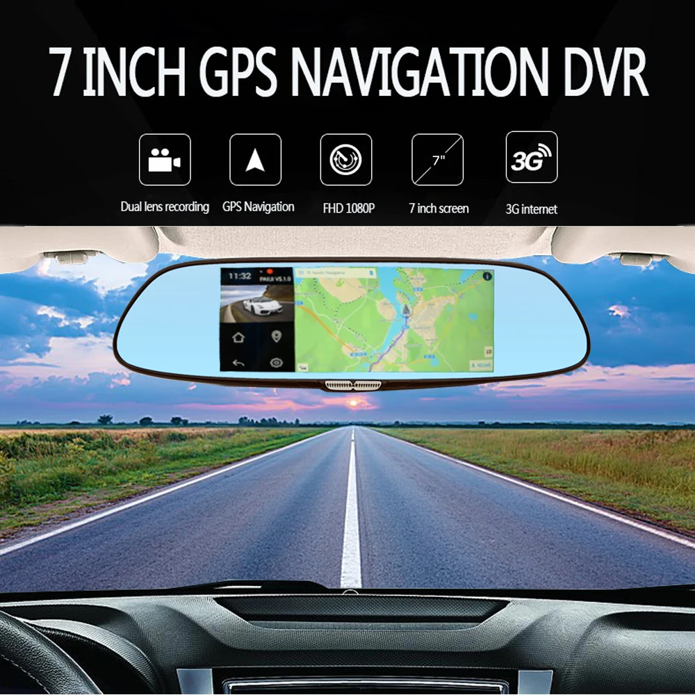 Podofo 7" Car GPS Navigation Android 5.0 Special 3G DVR Camera Bluetooth Dual Lens Rearview Mirror Video Recorder Registrar FHD 1080P Gps Navigator Automobile Dash cam