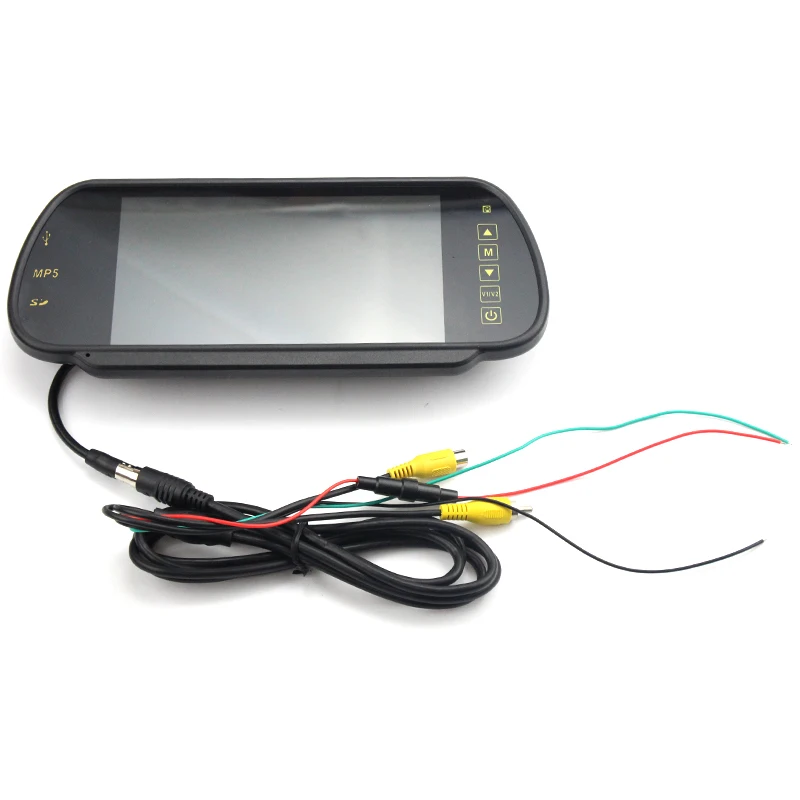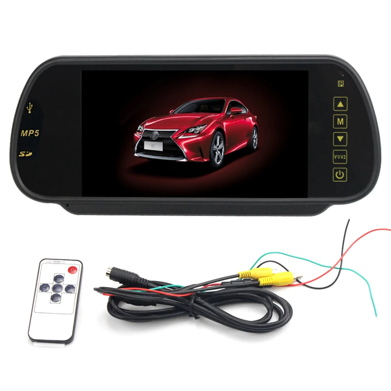 7" LED Backlight Color TFT LCD screen. Can directly replace your original reaview mirror.High-resolution picture. with Bluetooth Kit .Full color LED backlight display.With 2 AV input. (V2 to rearview camera, V1 to DVD/VCR/other video equipment)Parking rearview priority: The monitor will start up automatically, and synchronously display the video from rearview camera when youre backing your car; the monitor will close itself after backing. Scenes will cut to rearview camera automatically while youre backing the car and change back to the original scene after that. Supports Car DVD, VCD, camera, STB, satellite receiver, and other video equipment.With 2CH stero audio output.Can play video/audio files from SD card and USB flash disk. Enjoy HD movie and high quality music in your car.Built-in Speaker and FM transmitter function.Low power consumption.Controlled by an IR remote control or by touching the screen buttons. Specifications:Screen Size:7 inchDisplay Component: Color TFT-LCDNumber of Dots: 800W * RGB * 480HResponse Time: B→W 30ms W→B 10msVideo Frequency: PAL/NTSCInterface: 1 x USB, 1 x SDVideo: one way video inputAudio: Two way audio outputInput: DC 12VHousing: ABSColor: BlackProduct Dimensions: 250x118x45mmProduct weight: 463gPackage dimensions: 293x180x69mmPackage weight: 738g