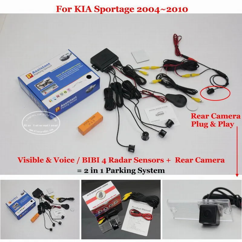 2 in 1 Visible & Vioce / BIBI Alarm Parking System For KIA Sportage 2004~2010 Car Parking Radar Sensors + Rear View Camerait detects the distance between the car and the back obstruction with ultrasonic sensors,it shows the far and near distances in the display, the obstruction image will be shown via the rear camera. coming with the alarm sounds (English Voice or BIBI sounds), detecting the safe area correctly.