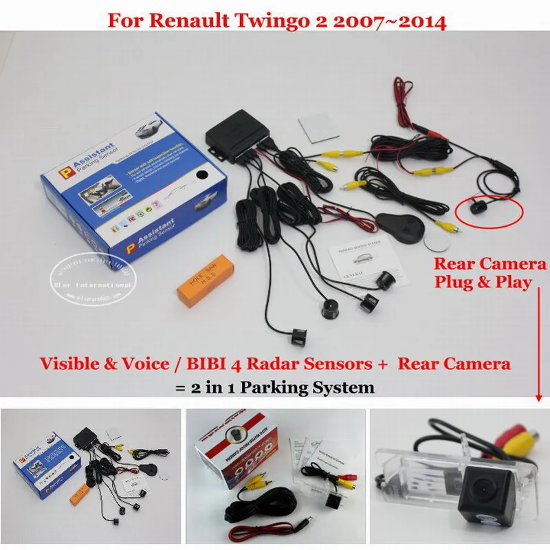 Perfect2 in 1 Visible & Vioce / BIBI Alarm Parking System For Renault Twingo 2 2007~2014 Car Parking Radar Sensors + Rear View Camerait detects the distance between the car and the back obstruction with ultrasonic sensors,it shows the far and near distances in the display, the obstruction image will be shown via the rear camera. coming with the alarm sounds (English Voice or BIBI sounds), detecting the safe area correctly.