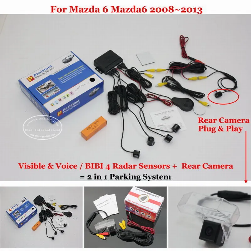 2 in 1 Visible & Vioce / BIBI Alarm Parking System For Mazda 6 Mazda6 2008~2013 Car Parking Radar Sensors + Rear View Camerait detects the distance between the car and the back obstruction with ultrasonic sensors,it shows the far and near distances in the display, the obstruction image will be shown via the rear camera. coming with the alarm sounds (English Voice or BIBI sounds), detecting the safe area correctly.