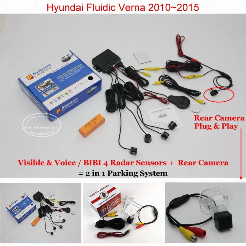 2 in 1 Visible & Vioce / BIBI Alarm Parking System For Hyundai Fluidic Verna 2010~2015 Car Parking Radar Sensors + Rear View Camera it detects the distance between the car and the back obstruction with ultrasonic sensors,it shows the far and near distances in the display, the obstruction image will be shown via the rear camera. coming with the alarm sounds (English Voice or BIBI sounds), detecting the safe area correctly.