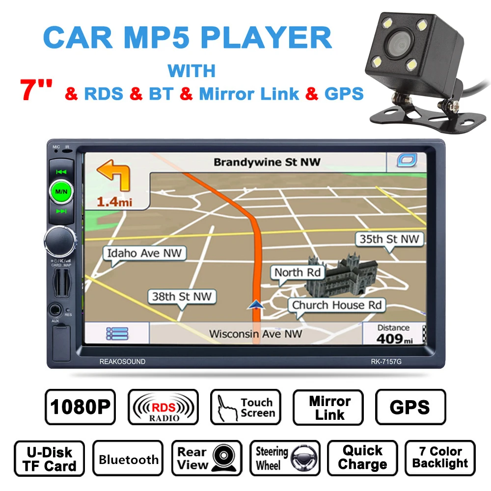 ...7 2 Din Bluetooth Car Multimedia Stereo MP5 GPS AM/FM/RDS Radio Player Support Mirror Link/Aux In with Rear View Camera