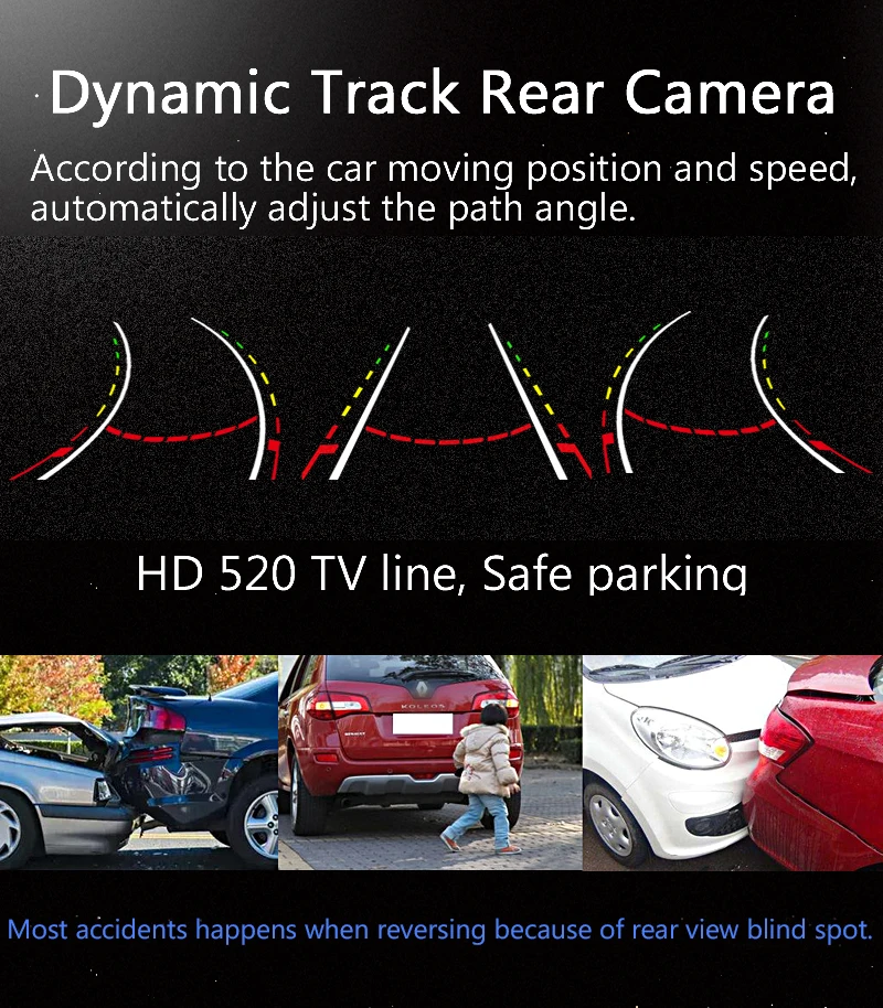 Feature: * Car Intelligent Dynamic Trajectory Tracks Parking Line. Fit For Android DVD Universal TFT LCD Car Monitor .* it not need path box, not need CANBUS or OBD interfaces, built-in reversing Tracks module.* Imported chips Coms reversing track, picture clarity, stability, good night vision effect.* Imported 150 super wide angle lens, waterproof, dust-proof, anti-fog, shock-proof.* Wide Angle, image recognition technology, precise trajectory reversing, the first leading technology..